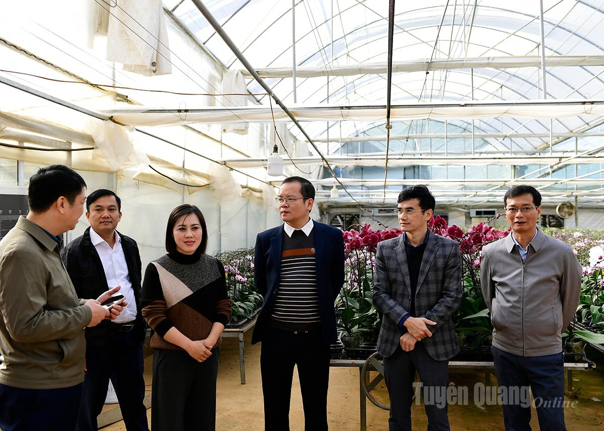 Lãnh đạo các xã đi cùng Đoàn công tác trao đổi, tìm hiểu mô hình trồng hoa lan của Công ty Cổ phần Hoa nhiệt đới, phường Mộc Châu.